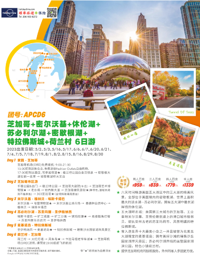 APCD6【金榜怡享】芝加哥接机+米尔沃基+休伦湖+苏必利尔湖+密歇根湖+特拉佛斯城+荷兰村 6日游