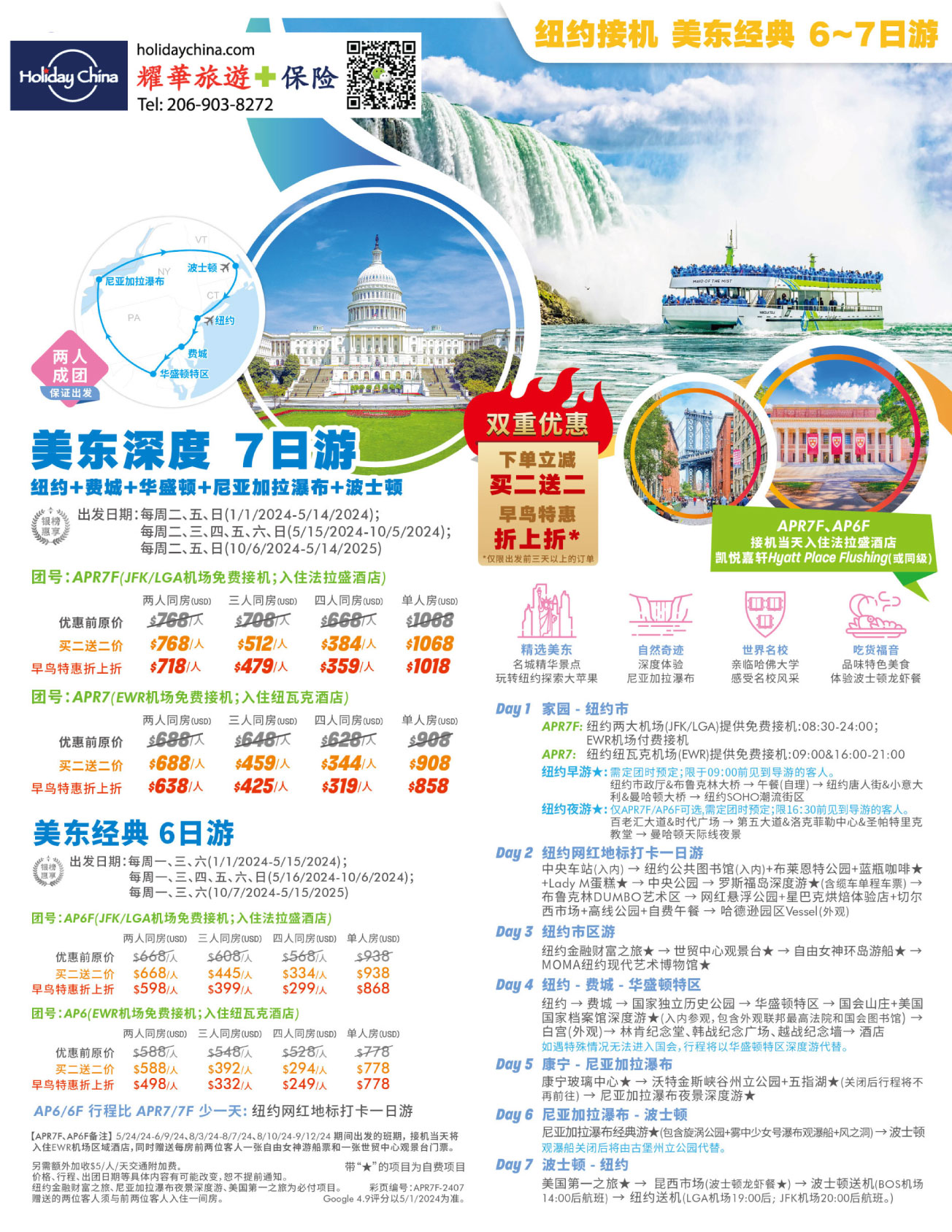 APR7 纽约+费城+华盛顿特区+尼亚加拉瀑布+波士顿 7日游