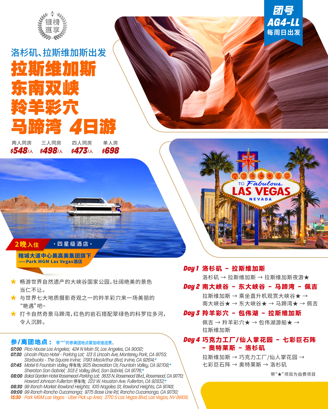 【银榜惠享】拉斯维加斯+东南双峡+羚羊彩穴+马蹄湾 4日游【洛杉矶进出】