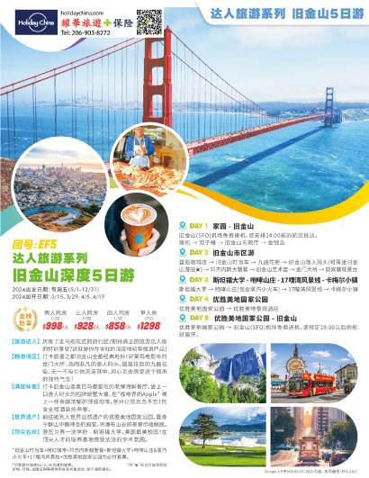 EF5【金榜怡享】 达人旅游系列精品小团丨旧金山深度 5日游