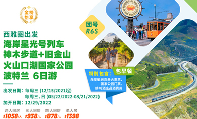 - R6S【金牌怡享】西雅图出发 海岸星光号列车+神木步道+旧金山+火山口湖国家公园+波特兰 6日游