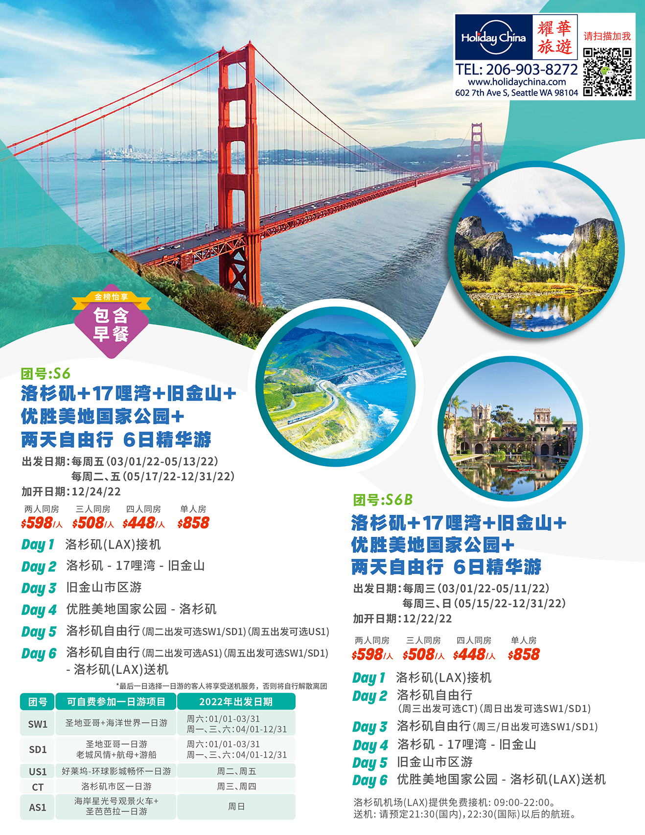 S6B【金榜怡享】洛杉矶+17哩湾+旧金山+优胜美地国家公园+两天自由行 6日精华游(套餐)