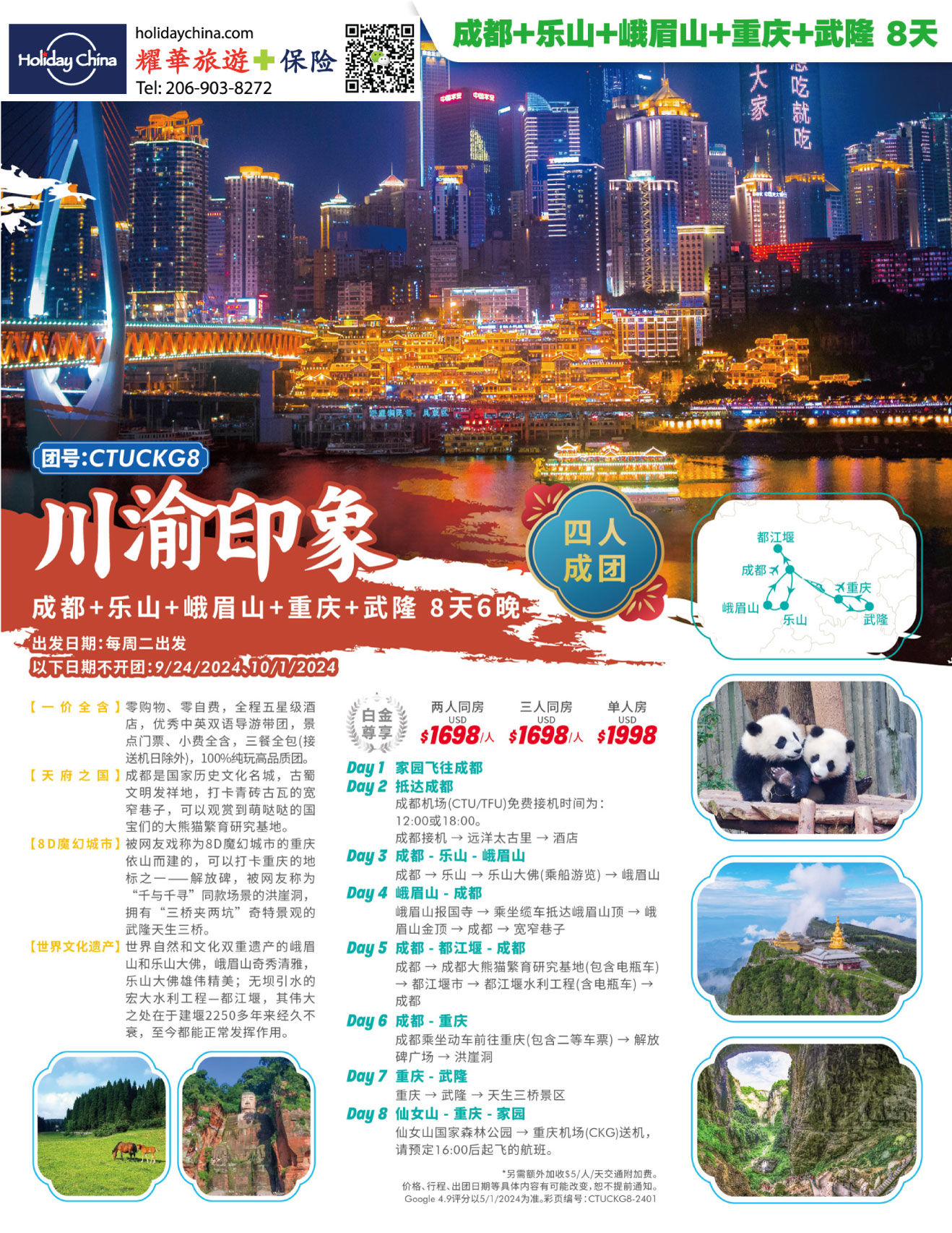 CTUCKG8【白金尊享】中国 成都+乐山+峨眉山+重庆+武隆 8天6晚游