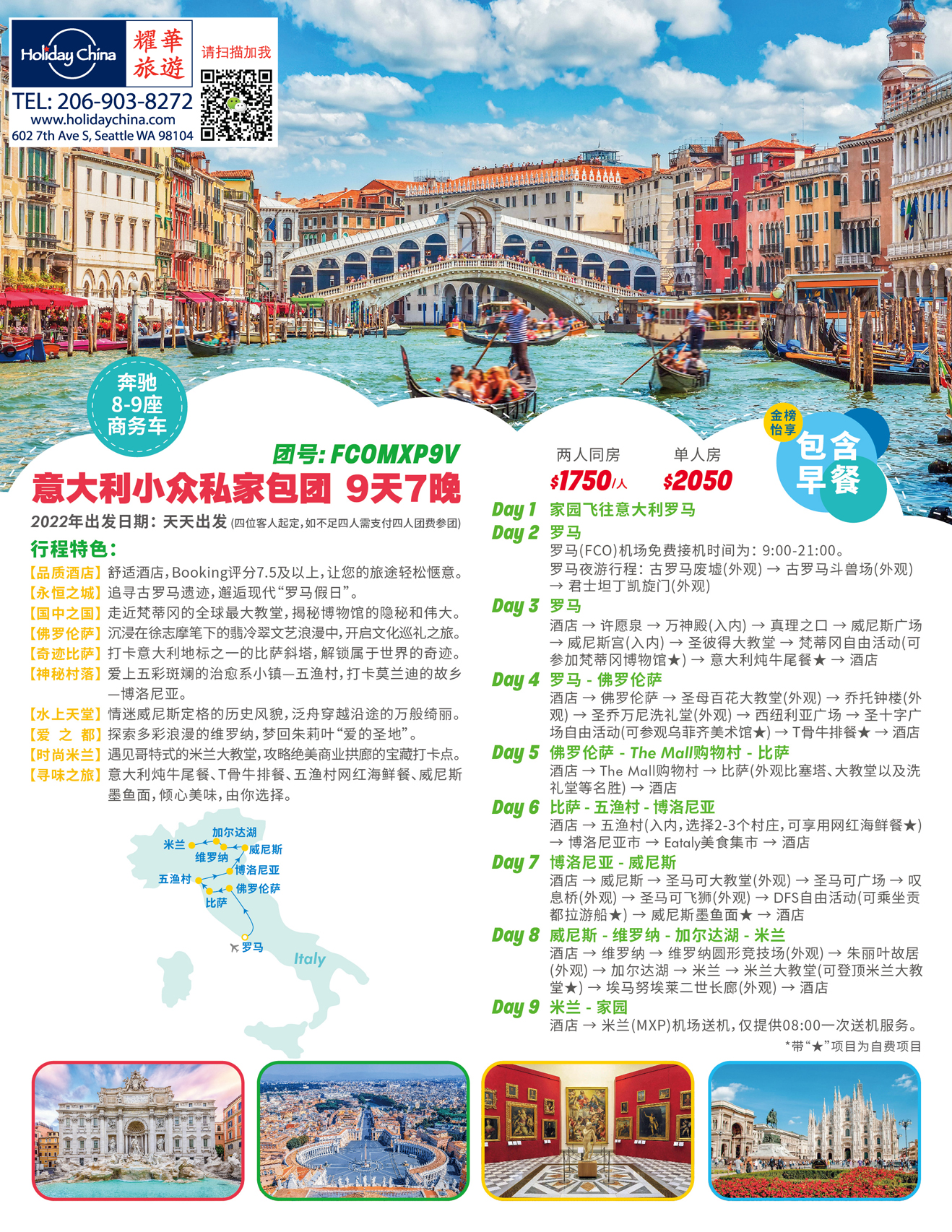 FCOMXP9V【金榜怡享】意大利一地4-7人小众私家包团丨罗马+梵蒂冈+佛罗伦萨+比萨+五渔村+博洛尼亚+威尼斯+维罗纳+米兰 9天7晚游